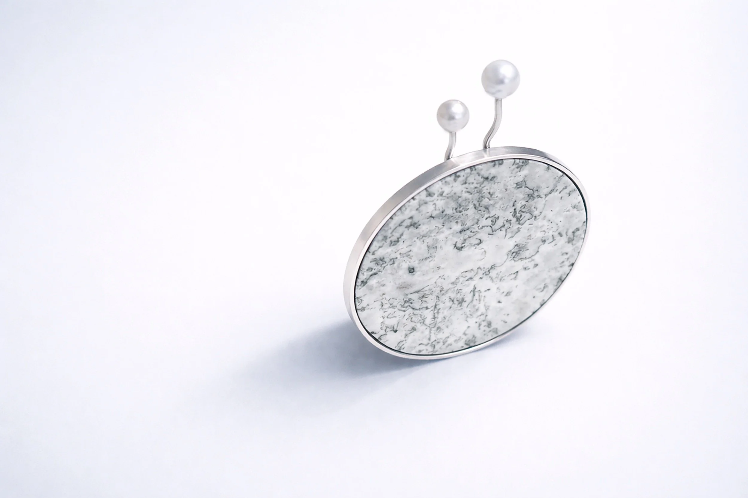 Aegis broche, Moder mosagat, sølv og hvide perler.